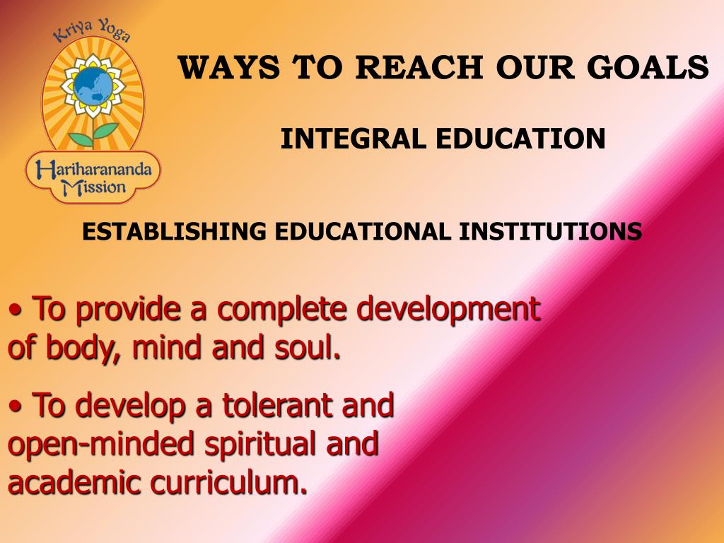 WAYS TO REACH OUR GOALS INTEGRAL EDUCATION ESTABLISHING EDUCATIONAL INSTITUTIONS • Toprovide a complete developmentof body, mind and soul. • Todevelop a tolerant and open-mindedspiritual and academiccurriculum.