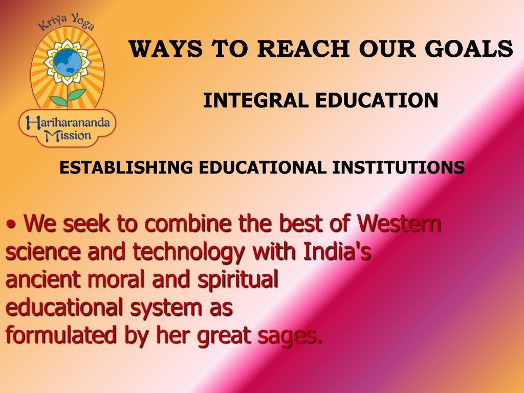 WAYS TO REACH OUR GOALS INTEGRAL EDUCATION ESTABLISHING EDUCATIONAL INSTITUTIONS • Weseekto combine thebest of Western science and technologywithIndia'sancientmoral and spiritual educationalsystem as formulatedbyhergreatsages.