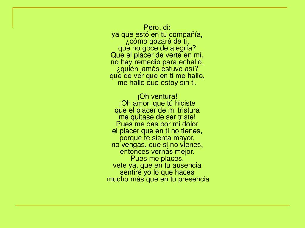 Pero, di: ya que estó en tu compañía, ¿cómo gozaré de ti, que no goce de alegría? Que el placer de verte en mí, no hay remedio para echallo, ¿quién jamás estuvo así? que de ver que en ti me hallo, me hallo que estoy sin ti. ¡Oh ventura! ¡Oh amor, que tú hiciste que el placer de mi tristura me quitase de ser triste! Pues me das por mi dolor el placer que en ti no tienes, porque te sienta mayor, no vengas, que si no vienes, entonces vernás mejor. Pues me places, vete ya, que en tu ausencia sentiré yo lo que haces mucho más que en tu presencia