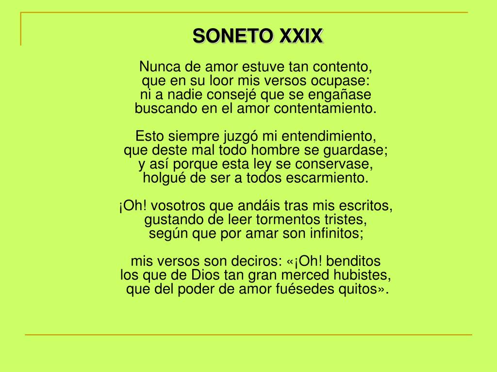 SONETO XXIXNunca de amor estuve tan contento, que en su loor mis versos ocupase: ni a nadie consejé que se engañase buscando en el amor contentamiento. Esto siempre juzgó mi entendimiento, que deste mal todo hombre se guardase; y así porque esta ley se conservase, holgué de ser a todos escarmiento. ¡Oh! vosotros que andáis tras mis escritos, gustando de leer tormentos tristes, según que por amar son infinitos; mis versos son deciros: «¡Oh! benditos los que de Dios tan gran merced hubistes, que del poder de amor fuésedes quitos».
