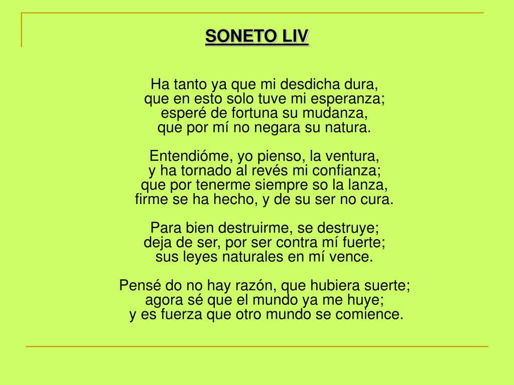SONETO LIV Ha tanto ya que mi desdicha dura, que en esto solo tuve mi esperanza; esperé de fortuna su mudanza, que por mí no negara su natura. Entendióme, yo pienso, la ventura, y ha tornado al revés mi confianza; que por tenerme siempre so la lanza, firme se ha hecho, y de su ser no cura. Para bien destruirme, se destruye; deja de ser, por ser contra mí fuerte; sus leyes naturales en mí vence. Pensé do no hay razón, que hubiera suerte; agora sé que el mundo ya me huye; y es fuerza que otro mundo se comience.