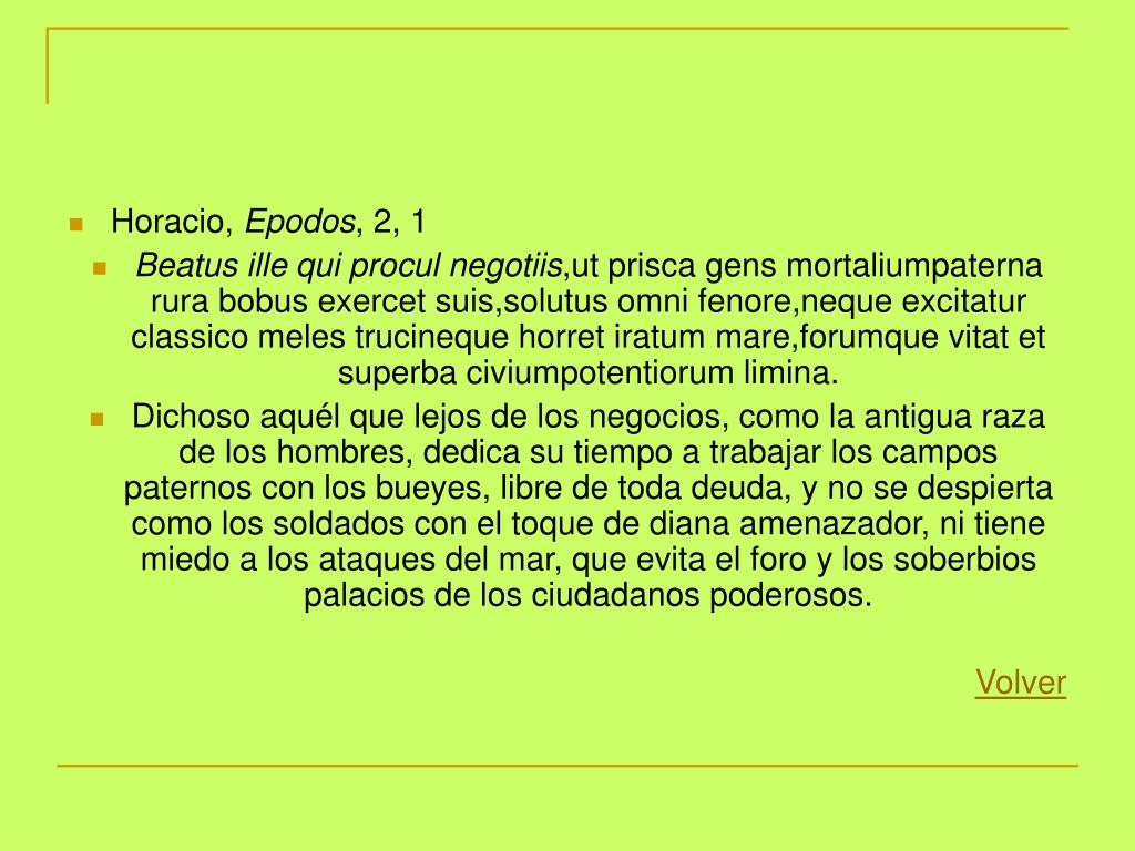 Horacio, Epodos, 2, 1 • Beatus ille qui procul negotiis,ut prisca gens mortaliumpaterna rura bobus exercet suis,solutus omni fenore,neque excitatur classico meles trucineque horret iratum mare,forumque vitat et superba civiumpotentiorum limina. • Dichoso aquél que lejos de los negocios, como la antigua raza de los hombres, dedica su tiempo a trabajar los campos paternos con los bueyes, libre de toda deuda, y no se despierta como los soldados con el toque de diana amenazador, ni tiene miedo a los ataques del mar, que evita el foro y los soberbios palacios de los ciudadanos poderosos. Volver
