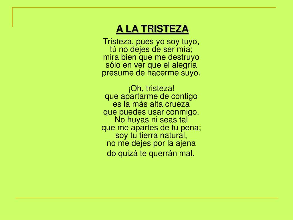 A LA TRISTEZATristeza, pues yo soy tuyo, tú no dejes de ser mía; mira bien que me destruyo sólo en ver que el alegría presume de hacerme suyo. ¡Oh, tristeza! que apartarme de contigo es la más alta crueza que puedes usar conmigo. No huyas ni seas tal que me apartes de tu pena; soy tu tierra natural, no me dejes por la ajena do quizá te querrán mal.