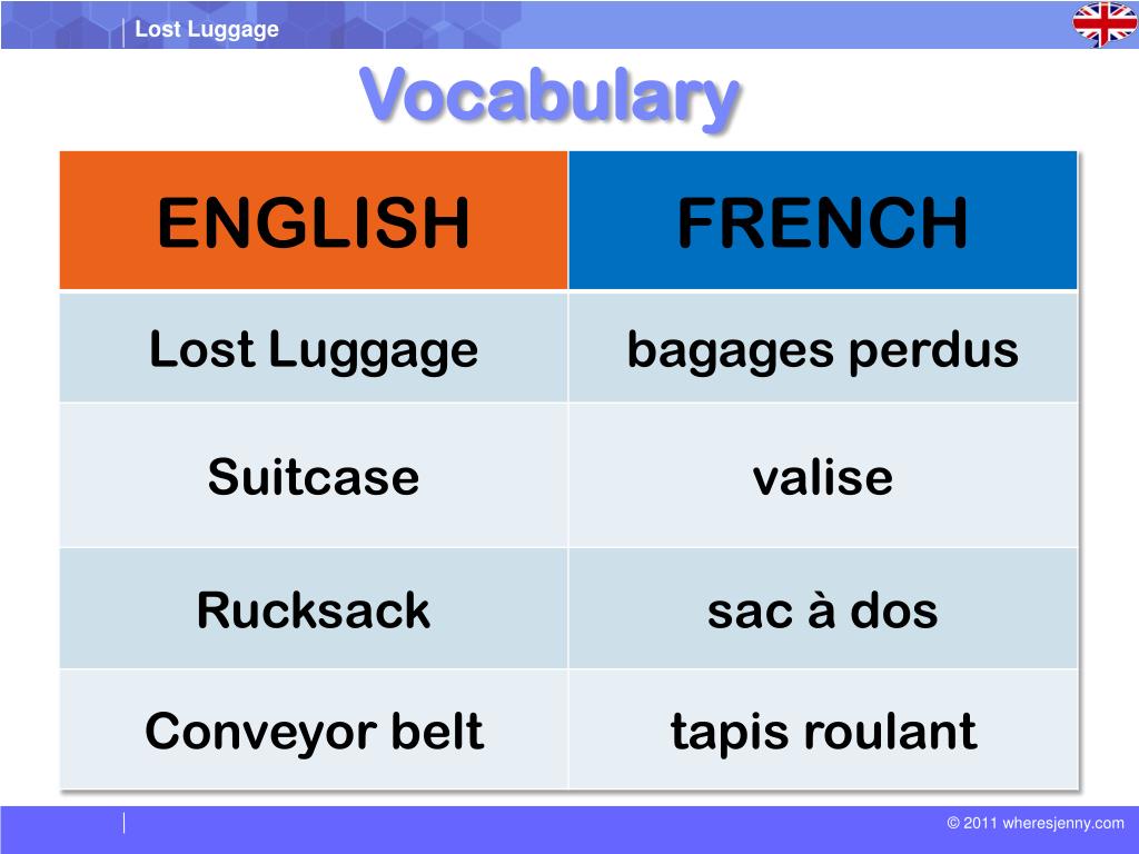 Lost Luggage ! ( Bagages perdus ). Vocabulary. Lost Luggage : Bags which have gone missing, cannot be found. Suitcase : A case with a handle and a hinged lid, used for carrying clothes. Rucksack : A bag with two shoulder straps which allow it to be carried on the back.