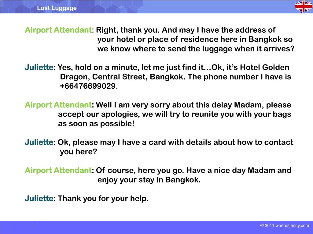 AirportAttendant: Right, thank you. And may I have the address of your hotel or place of residence here in Bangkok so we know where to send the luggage when it arrives? Juliette: Yes, hold on a minute, let me just find it…Ok, it’s Hotel Golden Dragon, Central Street, Bangkok. The phone number I have is +66476699029. AirportAttendant: Well I am very sorry about this delay Madam, please accept our apologies, we will try to reunite you with your bags as soon as possible! Juliette: Ok, please may I have a card with details about how to contact you here? AirportAttendant: Of course, here you go. Have a nice day Madam and enjoy your stay in Bangkok. Juliette: Thank you for your help.
