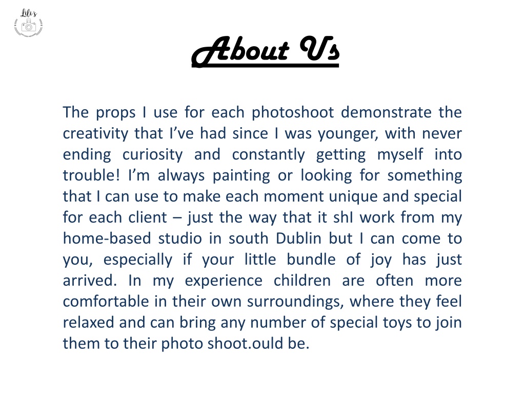 About Us The props I use for each photoshoot demonstrate the creativity that I’ve had since I was younger, with never ending curiosity and constantly getting myself into trouble! I’m always painting or looking for something that I can use to make each moment unique and special for each client – just the way that it shI work from my home-based studio in south Dublin but I can come to you, especially if your little bundle of joy has just arrived. In my experience children are often more comfortable in their own surroundings, where they feel relaxed and can bring any number of special toys to join them to their photo shoot.ould be.