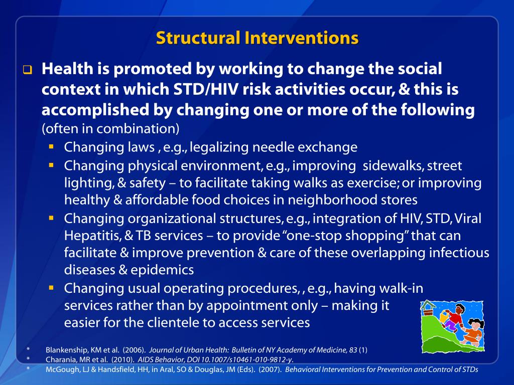 Structural Interventions • Health is promoted by working to change the social context in which STD/HIV risk activities occur, & this is accomplished by changing one or more of the following (often in combination) • Changing laws , e.g., legalizing needle exchange • Changing physical environment, e.g., improving sidewalks, street lighting, & safety – to facilitate taking walks as exercise; or improving healthy & affordable food choices in neighborhood stores • Changing organizational structures, e.g., integration of HIV, STD, Viral Hepatitis, & TB services – to provide “one-stop shopping” that can facilitate & improve prevention & care of these overlapping infectious diseases & epidemics • Changing usual operating procedures, , e.g., having walk-in services rather than by appointment only – making it easier for the clientele to access services Blankenship, KM et al. (2006). Journal of Urban Health: Bulletin of NY Academy of Medicine, 83 (1) Charania, MR et al. (2010). AIDS Behavior, DOI 10.1007/s10461-010-9812-y. McGough, LJ & Handsfield, HH, in Aral, SO & Douglas, JM (Eds). (2007). Behavioral Interventions for Prevention and Control of STDs
