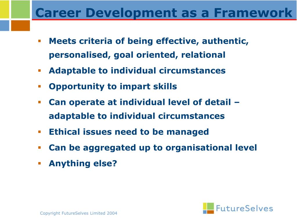 Career Development as a Framework • Meets criteria of being effective, authentic, personalised, goal oriented, relational • Adaptable to individual circumstances • Opportunity to impart skills • Can operate at individual level of detail – adaptable to individual circumstances • Ethical issues need to be managed • Can be aggregated up to organisational level • Anything else?