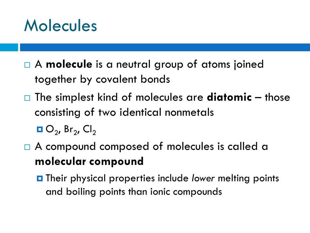 Molecules • A molecule is a neutral group of atoms joined together by covalent bonds • The simplest kind of molecules are diatomic – those consisting of two identical nonmetals • O2, Br2, Cl2 • A compound composed of molecules is called a molecular compound • Their physical properties include lower melting points and boiling points than ionic compounds