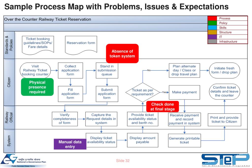 Sample Process Map with Problems, Issues & Expectations Absence of token system Physical presence required Check done at final stage Manual data entry