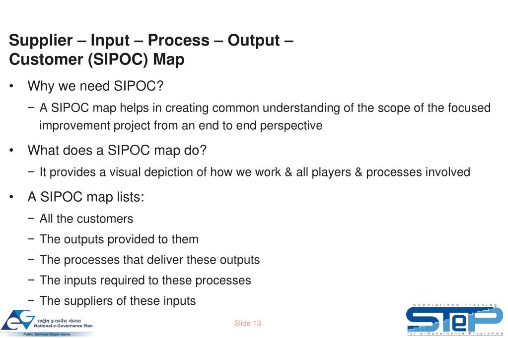 Supplier – Input – Process – Output – Customer (SIPOC) Map • Why we need SIPOC? • A SIPOC map helps in creating common understanding of the scope of the focused improvement project from an end to end perspective • What does a SIPOC map do? • It provides a visual depiction of how we work & all players & processes involved • A SIPOC map lists: • All the customers • The outputs provided to them • The processes that deliver these outputs • The inputs required to these processes • The suppliers of these inputs