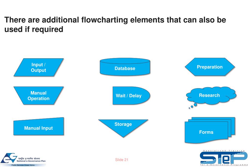 There are additional flowcharting elements that can also be used if required Database Preparation Input / Output Manual Operation Wait / Delay Research Manual Input Forms Storage