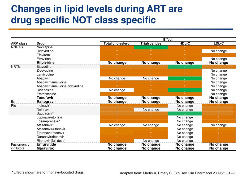 Changes in lipid levels during ART aredrug specific NOT class specific *Effects shown are for ritonavir-boosted drugs Adapted from: Martin A, Emery S. Exp Rev Clin Pharmacol 2009;2:381–90