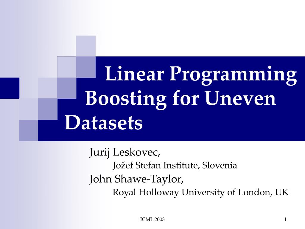 Linear Programming Boosting for Uneven Datasets Jurij Leskovec, Jožef Stefan Institute, Slovenia John Shawe-Taylor, Royal Holloway University of London, UK ICML 2003