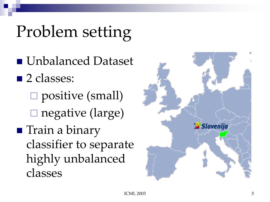 Problem setting • Unbalanced Dataset • 2 classes: • positive (small) • negative (large) • Train a binary classifier to separate highly unbalanced classes ICML 2003