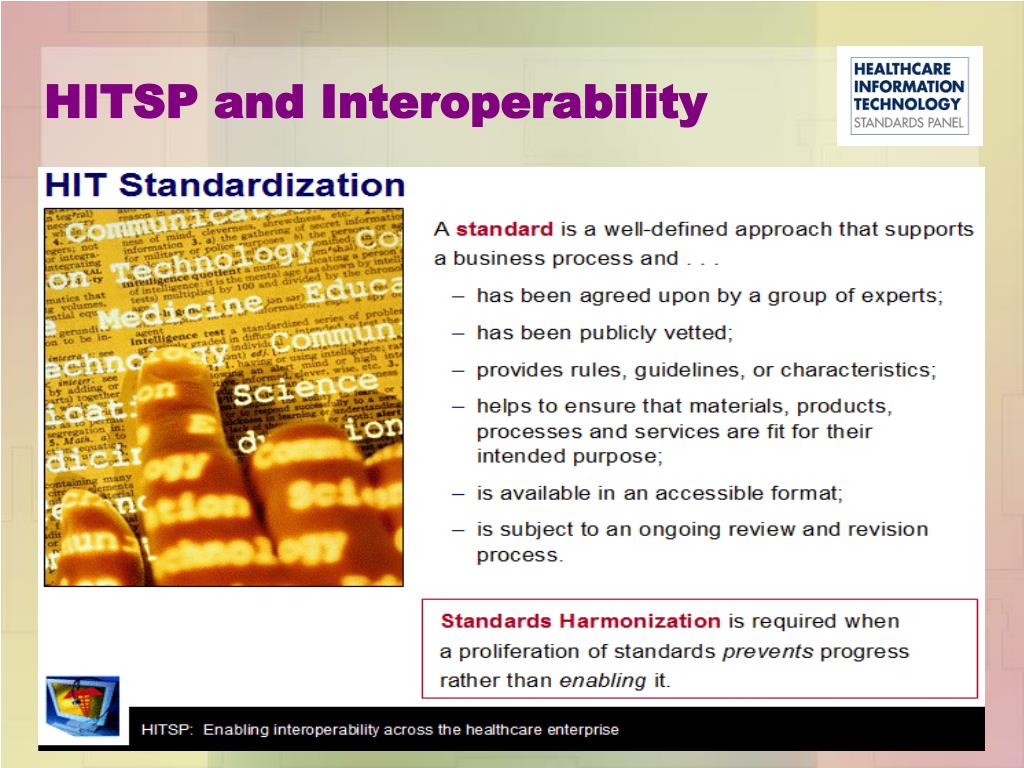 The National HIT/HIE Interoperability Standardization Process Business/ Data Needs Definition Standards Development Process Standards Selection, Evaluation, Harmonization Industry-specific groups (i.e., payer, providers, public health) SDOs (i.e., X12, HL7, ASTM) Vocabulary (i.e., SNOMED, LOINC) HITSP Integrating the Healthcare Enterprise (IHE) Adoption and Use Certification Testing Industry Government CCHIT NHIN Industry Groups (i.e., vendors, providers)