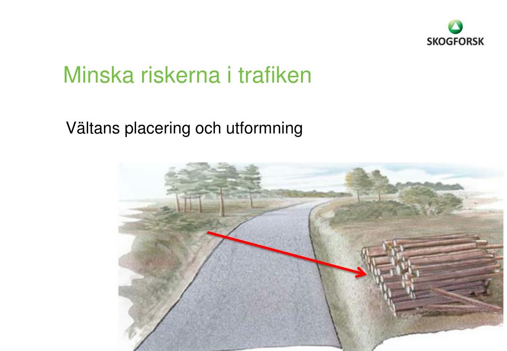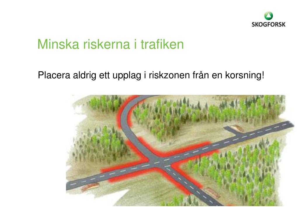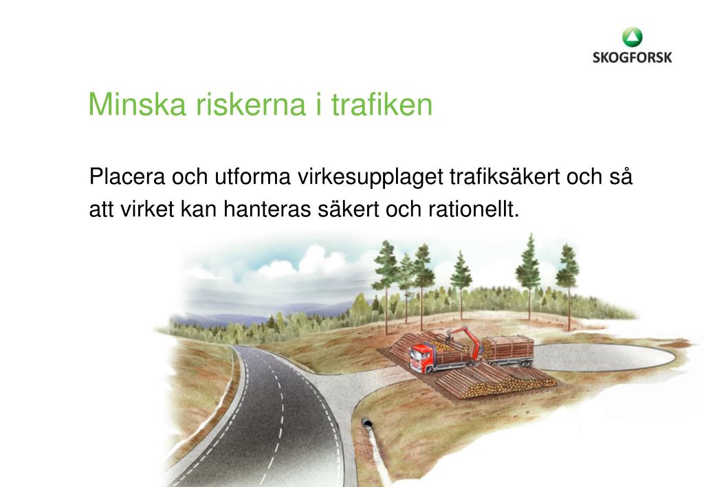 Minska riskerna i trafiken Placera och utforma virkesupplaget trafiksäkert och så att virket kan hanteras säkert och rationellt.