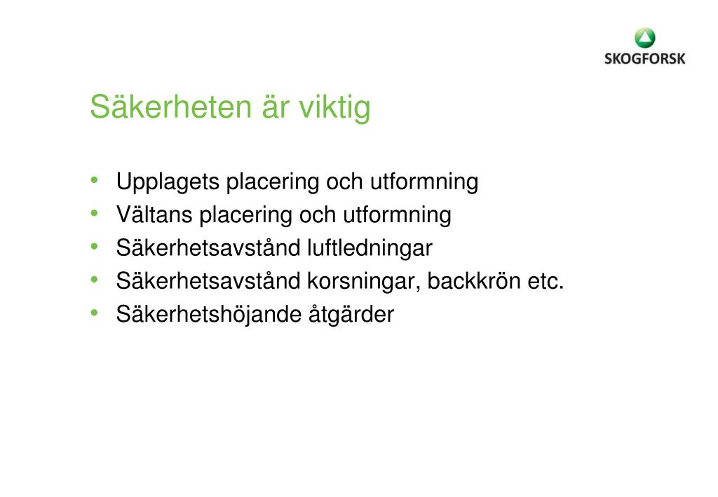 Säkerheten är viktig • Upplagets placering och utformning • Vältans placering och utformning • Säkerhetsavstånd luftledningar • Säkerhetsavstånd korsningar, backkrön etc. • Säkerhetshöjande åtgärder