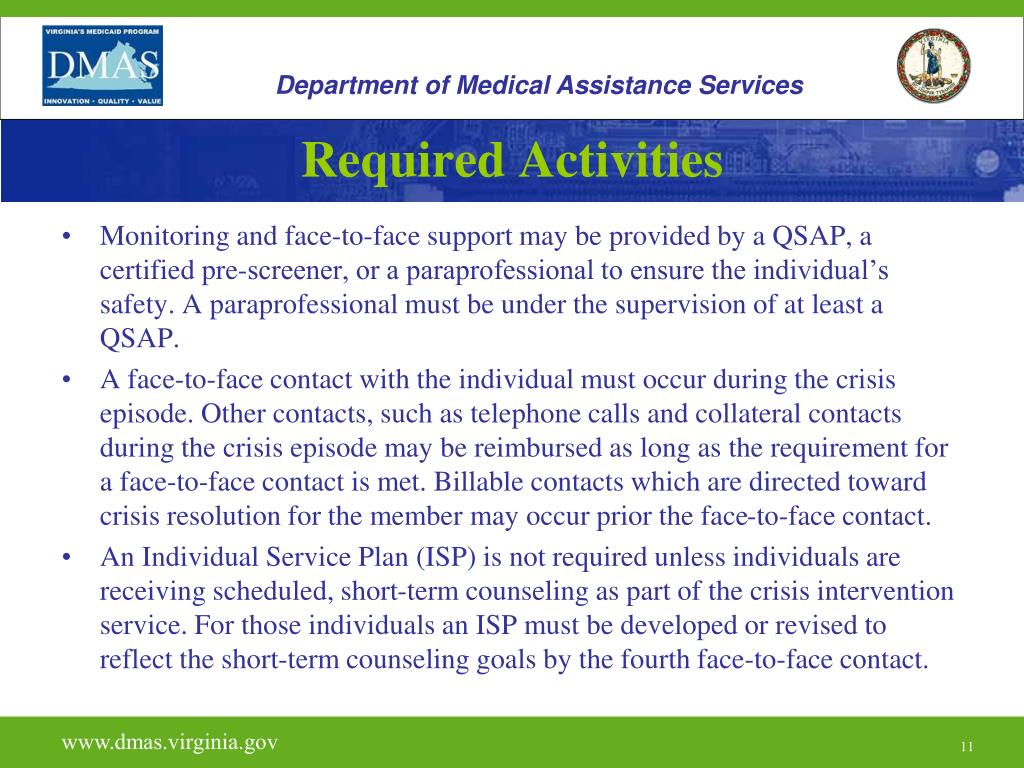 Department of Medical Assistance Services Required Activities • A certified pre-screener, or QSAP must complete and document a face-to-face service specific provider assessment of the crisis situation; provide short-term counseling to stabilize the individual or family unit; provide access to further immediate assessment and follow-up; and link the individual and family with ongoing care to prevent future crises. • There must be documentation of immediate substance abuse treatment with the objectives of preventing exacerbation of a condition, preventing injury to the individual and others, and providing treatment in the context of the least restrictive setting. • Services may include office visits, home visits, pre-admission screening, telephone contacts, or other client related activities for the prevention of institutionalization. Services may be provided to individuals outside of the clinic and billed if it is clinically or programmatically appropriate www.dmas.virginia.gov 10