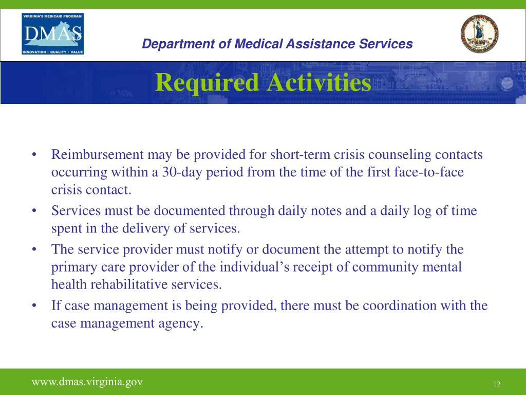 Department of Medical Assistance Services Required Activities • Monitoring and face-to-face support may be provided by a QSAP, a certified pre-screener, or a paraprofessional to ensure the individual’s safety. A paraprofessional must be under the supervision of at least a QSAP. • A face-to-face contact with the individual must occur during the crisis episode. Other contacts, such as telephone calls and collateral contacts during the crisis episode may be reimbursed as long as the requirement for a face-to-face contact is met. Billable contacts which are directed toward crisis resolution for the member may occur prior the face-to-face contact. • An Individual Service Plan (ISP) is not required unless individuals are receiving scheduled, short-term counseling as part of the crisis intervention service. For those individuals an ISP must be developed or revised to reflect the short-term counseling goals by the fourth face-to-face contact. www.dmas.virginia.gov 11