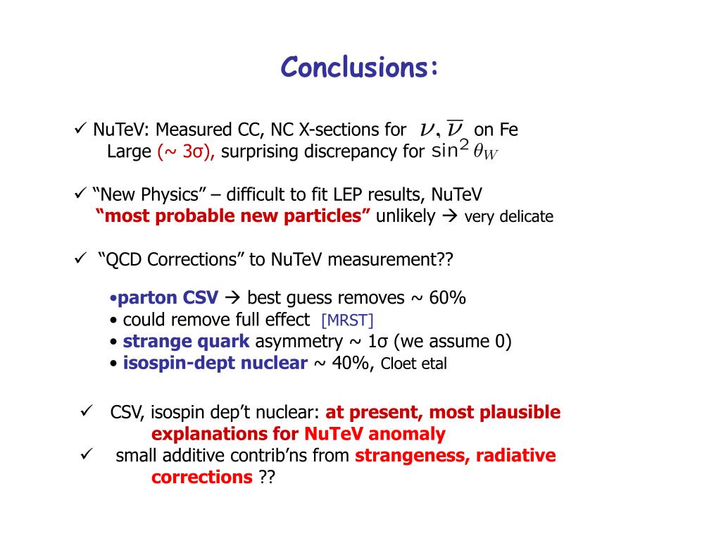 Conclusions: • NuTeV: Measured CC, NC X-sections for on Fe Large (~ 3σ), surprising discrepancy for • “New Physics” – difficult to fit LEP results, NuTeV “most probable new particles” unlikely very delicate • “QCD Corrections” to NuTeV measurement?? • parton CSV best guess removes ~ 60% • could remove full effect [MRST] • strange quark asymmetry ~ 1σ (we assume 0) • isospin-dept nuclear ~ 40%, Cloet etal