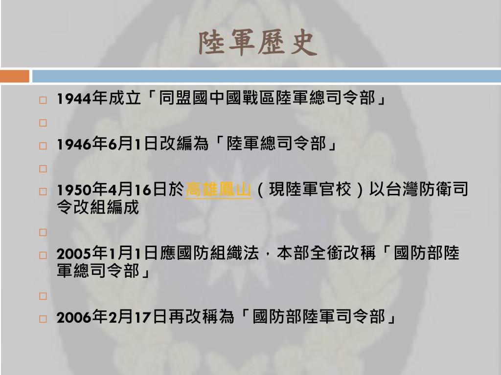 中華民國陸軍. 歷史 陸軍 兵 科 武器 裝備 未來展望. 陸軍歷史. 1944 年成立「同盟國中國戰區陸軍總司令部」 1946 年 6 月 1 日改編為「陸軍總司令部」 1950 年 4 月 16 日於 高雄 鳳山 (現陸軍官校)以台灣防衛司令改組編成 2005 年 1 月 1 日應國防組織法,本部全銜改稱「國防部陸軍總司令部」 2006 年 2 月 17 日再改稱為「國防部陸軍司令部」. 陸軍官科. 陸軍軍銜. 武器裝備. 武器裝備以聯戰指管、陸航、野戰防空及地面防衛等「核心戰力」為主。