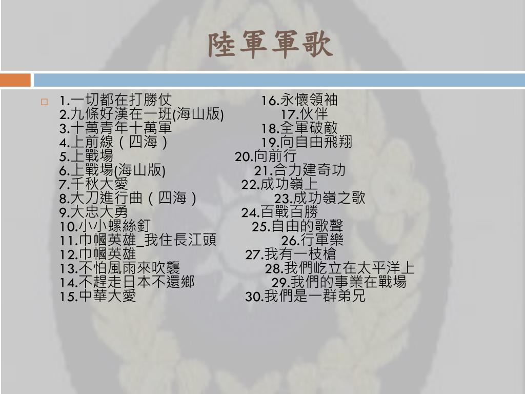 陸軍軍歌 • 1.一切都在打勝仗 16.永懷領袖2.九條好漢在一班(海山版) 17.伙伴3.十萬青年十萬軍 18.全軍破敵4.上前線(四海) 19.向自由飛翔5.上戰場20.向前行6.上戰場(海山版) 21.合力建奇功7.千秋大愛 22.成功嶺上8.大刀進行曲(四海) 23.成功嶺之歌9.大忠大勇 24.百戰百勝10.小小螺絲釘 25.自由的歌聲11.巾幗英雄_我住長江頭 26.行軍樂12.巾幗英雄 27.我有一枝槍13.不怕風雨來吹襲 28.我們屹立在太平洋上14.不趕走日本不還鄉 29.我們的事業在戰場15.中華大愛 30.我們是一群弟兄