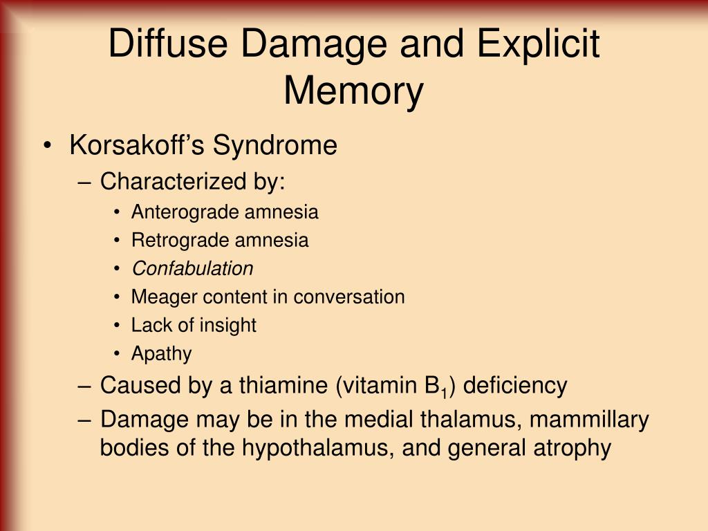 Diffuse Damage and Explicit Memory • Korsakoff’s Syndrome • Characterized by: • Anterograde amnesia • Retrograde amnesia • Confabulation • Meager content in conversation • Lack of insight • Apathy • Caused by a thiamine (vitamin B1) deficiency • Damage may be in the medial thalamus, mammillary bodies of the hypothalamus, and general atrophy