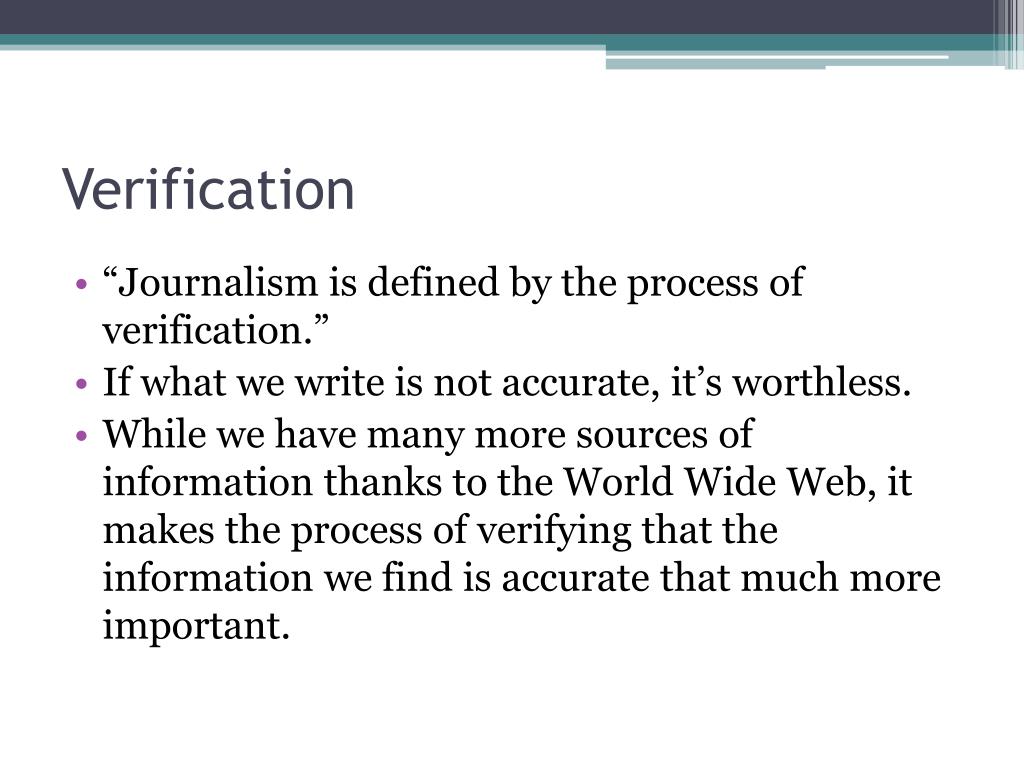 Verification • “Journalism is defined by the process of verification.” • If what we write is not accurate, it’s worthless. • While we have many more sources of information thanks to the World Wide Web, it makes the process of verifying that the information we find is accurate that much more important.