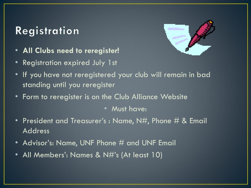 Registration • All Clubs need to reregister! • Registration expired July 1st • If you have not reregistered your club will remain in bad standing until you reregister • Form to reregister is on the Club Alliance Website • Must have: • President and Treasurer’s : Name, N#, Phone # & Email Address • Advisor’s: Name, UNF Phone # and UNF Email • All Members’: Names & N#’s (At least 10)