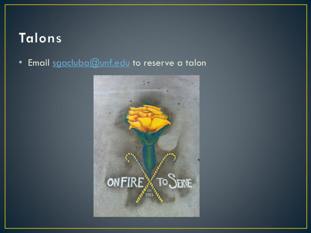 Talons • Email sgacluba@unf.edu to reserve a talon
