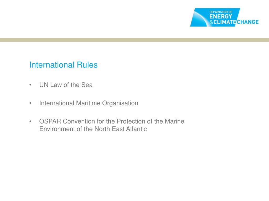 International Rules • UN Law of the Sea • International Maritime Organisation • OSPAR Convention for the Protection of the Marine Environment of the North East Atlantic