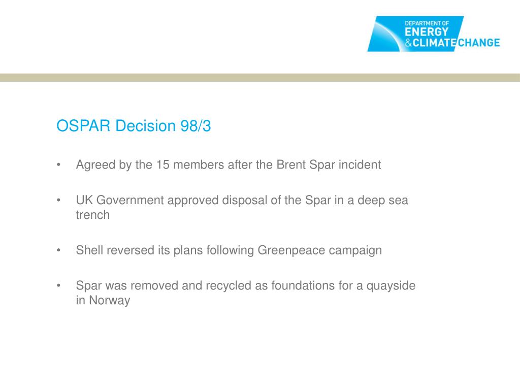 OSPAR Decision 98/3 • Agreed by the 15 members after the Brent Spar incident • UK Government approved disposal of the Spar in a deep sea trench • Shell reversed its plans following Greenpeace campaign • Spar was removed and recycled as foundations for a quayside in Norway