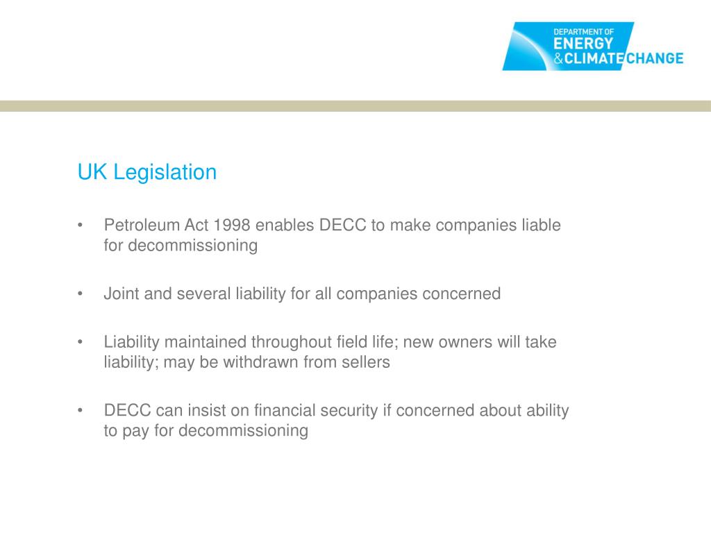 UK Legislation • Petroleum Act 1998 enables DECC to make companies liable for decommissioning • Joint and several liability for all companies concerned • Liability maintained throughout field life; new owners will take liability; may be withdrawn from sellers • DECC can insist on financial security if concerned about ability to pay for decommissioning