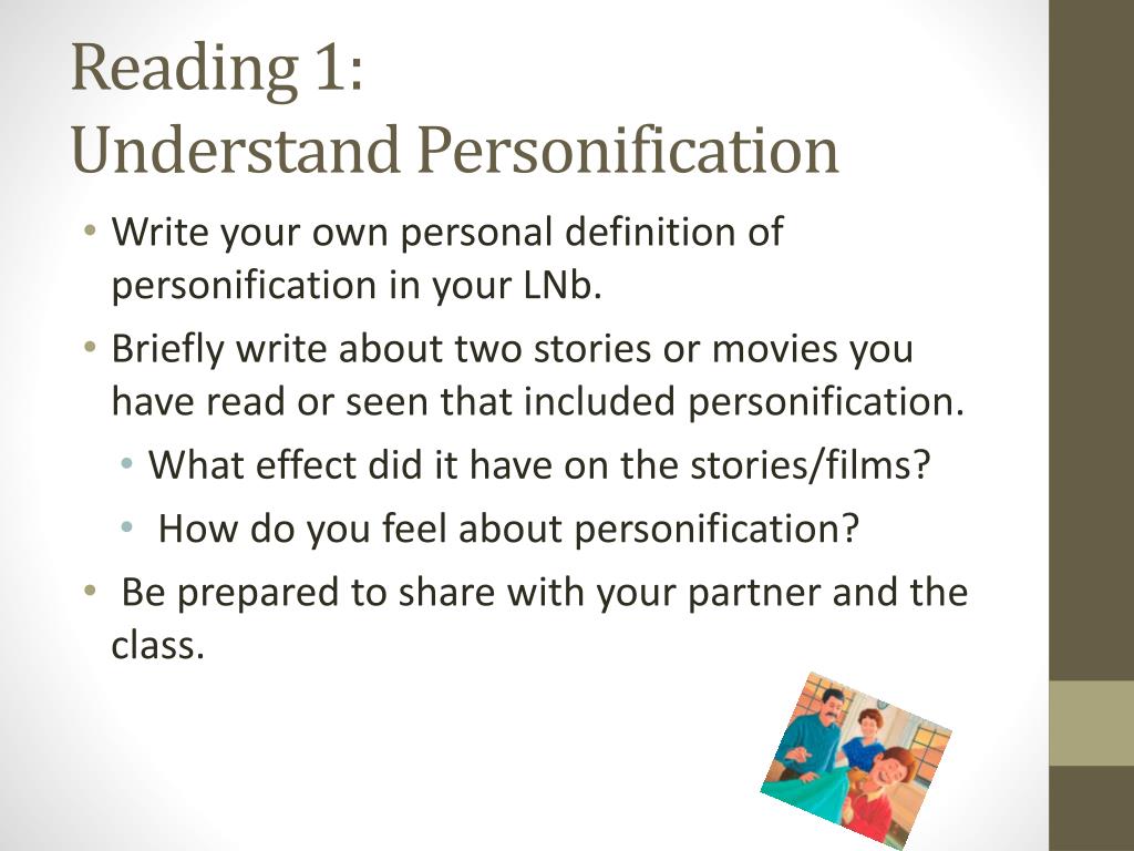 Reading 1:Understand Personification • Write your own personal definition of personification in your LNb. • Briefly write about two stories or movies you have read or seen that included personification. • What effect did it have on the stories/films? • How do you feel about personification? • Be prepared to share with your partner and the class.