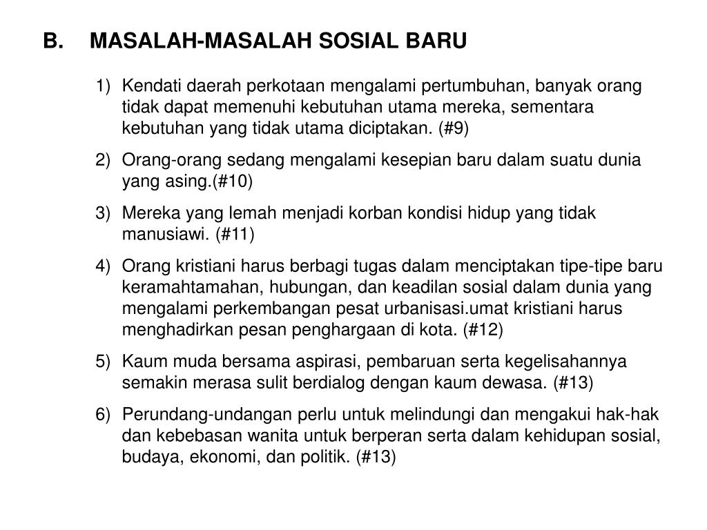 Kendati daerah perkotaan mengalami pertumbuhan, banyak orang tidak dapat memenuhi kebutuhan utama mereka, sementara kebutuhan yang tidak utama diciptakan. (#9) • Orang-orang sedang mengalami kesepian baru dalam suatu dunia yang asing.(#10) • Mereka yang lemah menjadi korban kondisi hidup yang tidak manusiawi. (#11) • Orang kristiani harus berbagi tugas dalam menciptakan tipe-tipe baru keramahtamahan, hubungan, dan keadilan sosial dalam dunia yang mengalami perkembangan pesat urbanisasi.umat kristiani harus menghadirkan pesan penghargaan di kota. (#12) • Kaum muda bersama aspirasi, pembaruan serta kegelisahannya semakin merasa sulit berdialog dengan kaum dewasa. (#13) • Perundang-undangan perlu untuk melindungi dan mengakui hak-hak dan kebebasan wanita untuk berperan serta dalam kehidupan sosial, budaya, ekonomi, dan politik. (#13) • MASALAH-MASALAH SOSIAL BARU