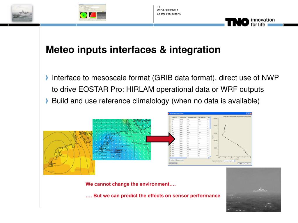 Eostar Pro suite v2 Meteo inputs interfaces & integration • Interface to mesoscale format (GRIB data format), direct use of NWP to drive EOSTAR Pro: HIRLAM operational data or WRF outputs • Build and use referenceclimalology (when no data isavailable) We cannot change the environment….…. But we can predict the effects on sensor performance