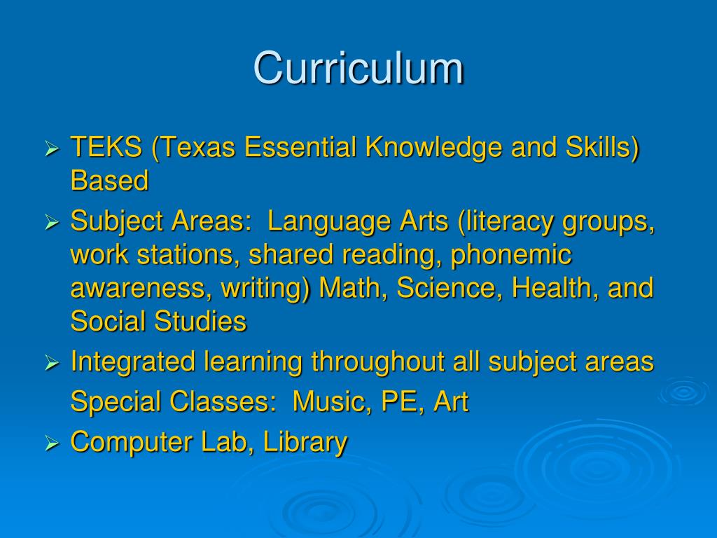Curriculum • TEKS (Texas Essential Knowledge and Skills) Based • Subject Areas: Language Arts (literacy groups, work stations, shared reading, phonemic awareness, writing) Math, Science, Health, and Social Studies • Integrated learning throughout all subject areas Special Classes: Music, PE, Art • Computer Lab, Library