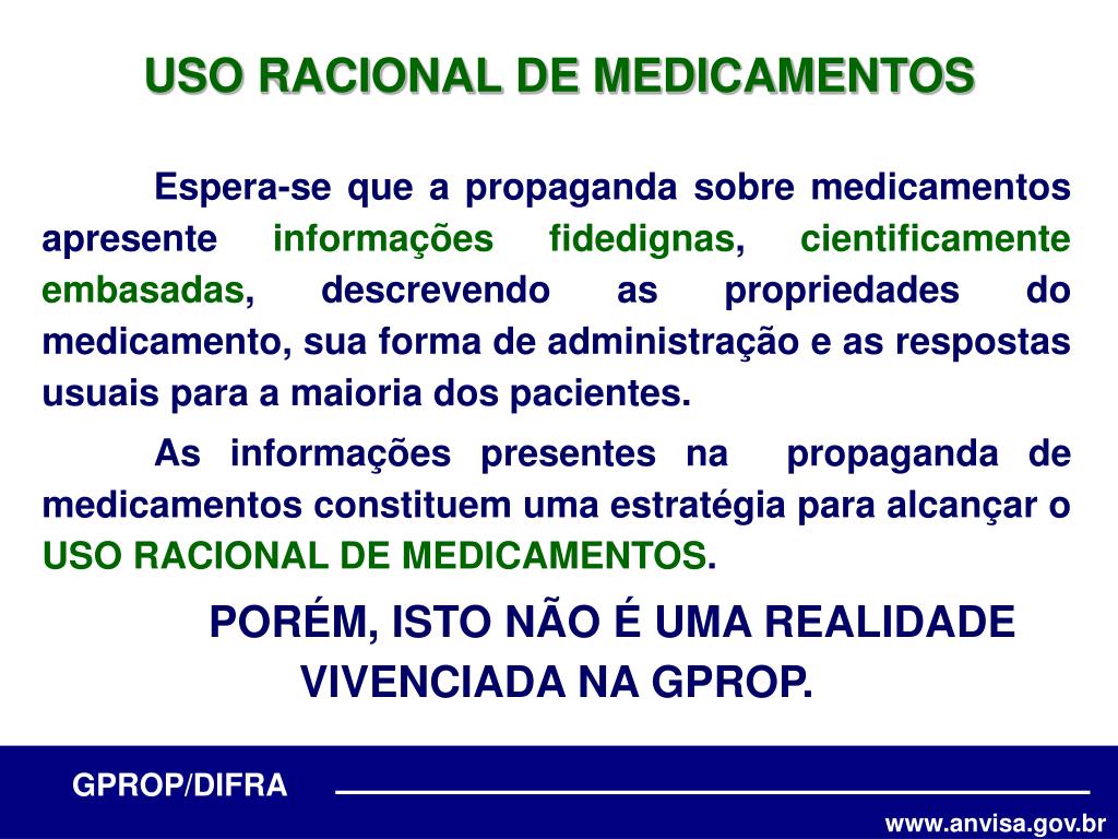 USO RACIONAL DE MEDICAMENTOS Espera-se que a propaganda sobre medicamentos apresente informações fidedignas, cientificamente embasadas, descrevendo as propriedades do medicamento, sua forma de administração e as respostas usuais para a maioria dos pacientes. As informações presentes na propaganda de medicamentos constituem uma estratégia para alcançar o USO RACIONAL DE MEDICAMENTOS. PORÉM, ISTO NÃO É UMA REALIDADE VIVENCIADA NA GPROP.