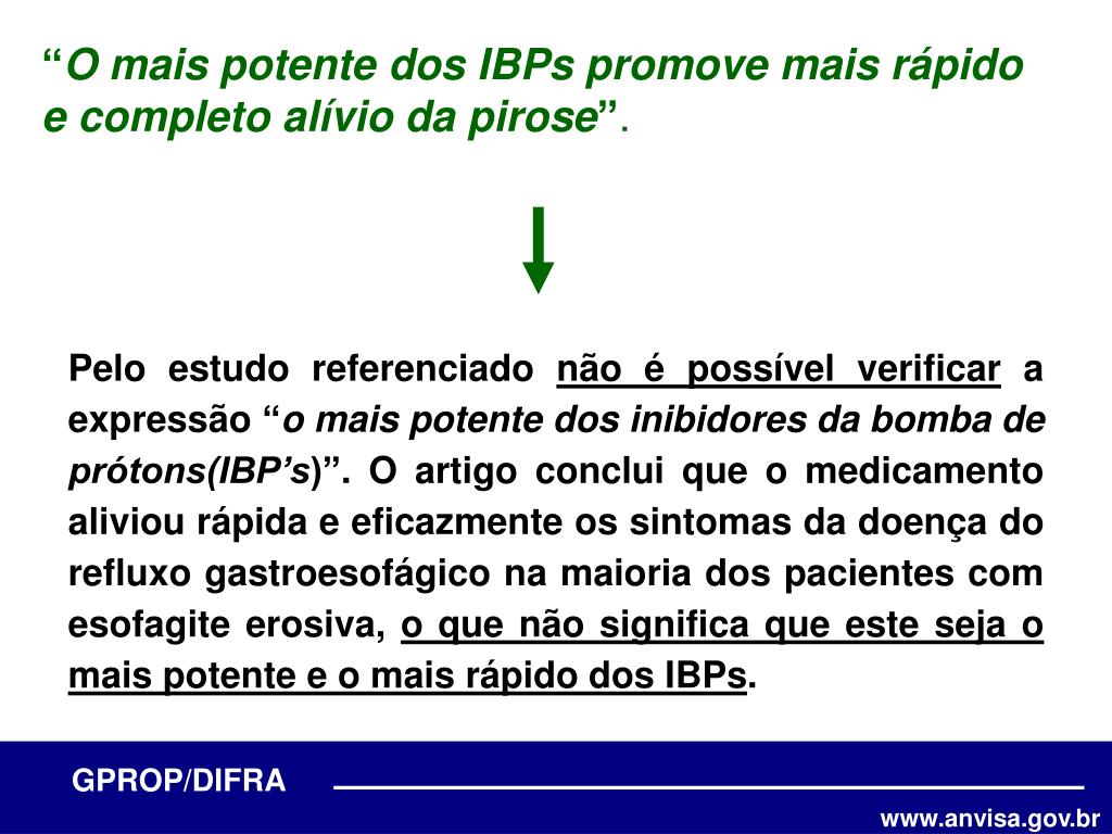 “O mais potente dos IBPs promove mais rápido e completo alívio da pirose”. Pelo estudo referenciado não é possível verificar a expressão “o mais potente dos inibidores da bomba de prótons(IBP’s)”. O artigo conclui que o medicamento aliviou rápida e eficazmente os sintomas da doença do refluxo gastroesofágico na maioria dos pacientes com esofagite erosiva, o que não significa que este seja o mais potente e o mais rápido dos IBPs.