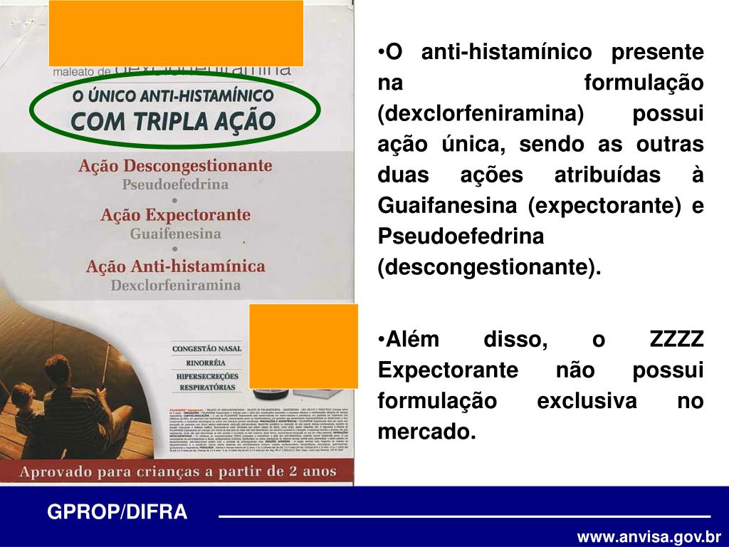 O anti-histamínico presente na formulação (dexclorfeniramina) possui ação única, sendo as outras duas ações atribuídas à Guaifanesina (expectorante) e Pseudoefedrina (descongestionante). • Além disso, o ZZZZ Expectorante não possui formulação exclusiva no mercado.