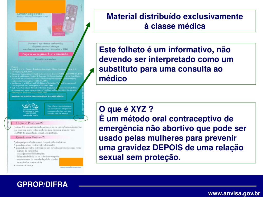 Material distribuído exclusivamente à classe médica Este folheto é um informativo, não devendo ser interpretado como um substituto para uma consulta ao médico O que é XYZ ? É um método oral contraceptivo de emergência não abortivo que pode ser usado pelas mulheres para prevenir uma gravidez DEPOIS de uma relação sexual sem proteção.