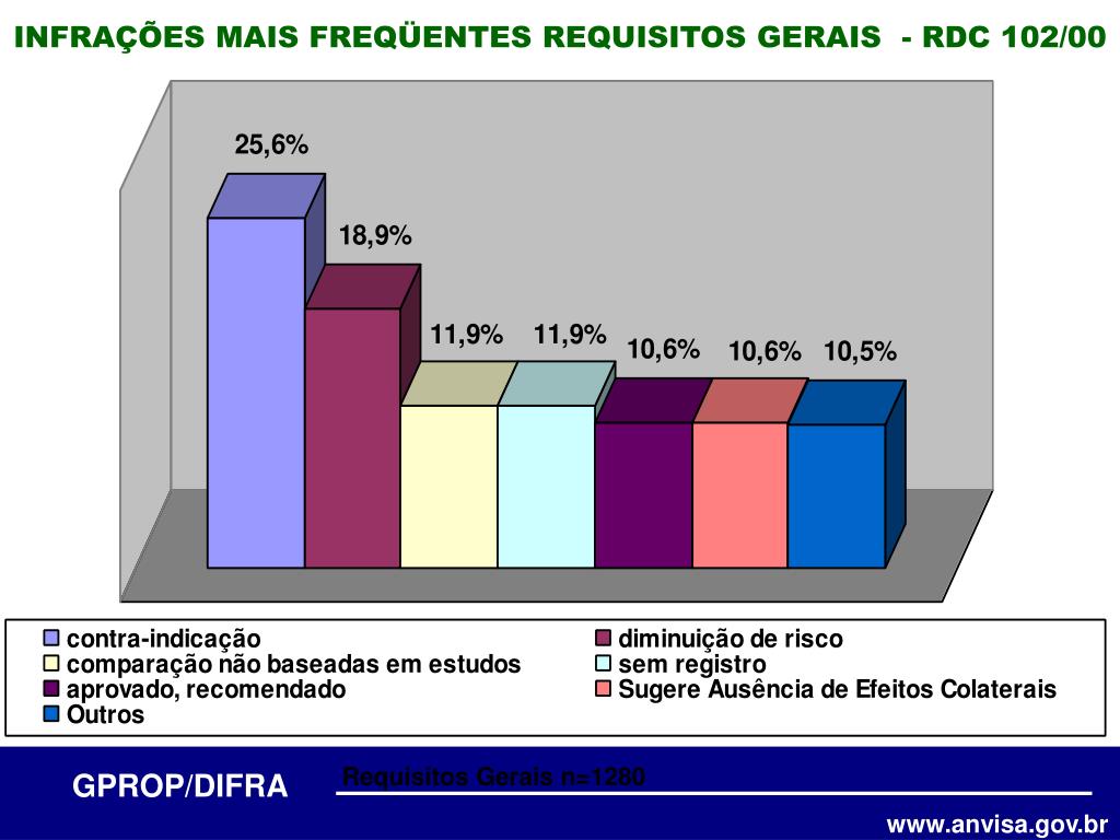 INFRAÇÕES MAIS FREQÜENTES REQUISITOS GERAIS - RDC 102/00 Requisitos Gerais n=1280