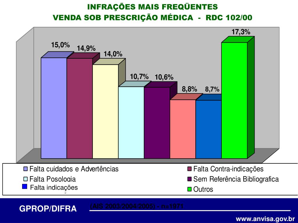 INFRAÇÕES MAIS FREQÜENTES VENDA SOB PRESCRIÇÃO MÉDICA - RDC 102/00 Falta indicações (AIS 2003/2004/2005) - n=1971