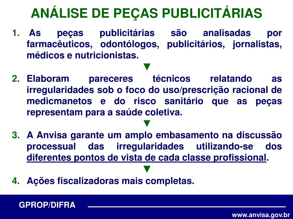 ANÁLISE DE PEÇAS PUBLICITÁRIAS • As peças publicitárias são analisadas por farmacêuticos, odontólogos, publicitários, jornalistas, médicos e nutricionistas. • ▼ • Elaboram pareceres técnicos relatando as irregularidades sob o foco do uso/prescrição racional de medicmanetos e do risco sanitário que as peças representam para a saúde coletiva. • ▼ • A Anvisa garante um amplo embasamento na discussão processual das irregularidades utilizando-se dos diferentes pontos de vista de cada classe profissional. • ▼ • Ações fiscalizadoras mais completas.