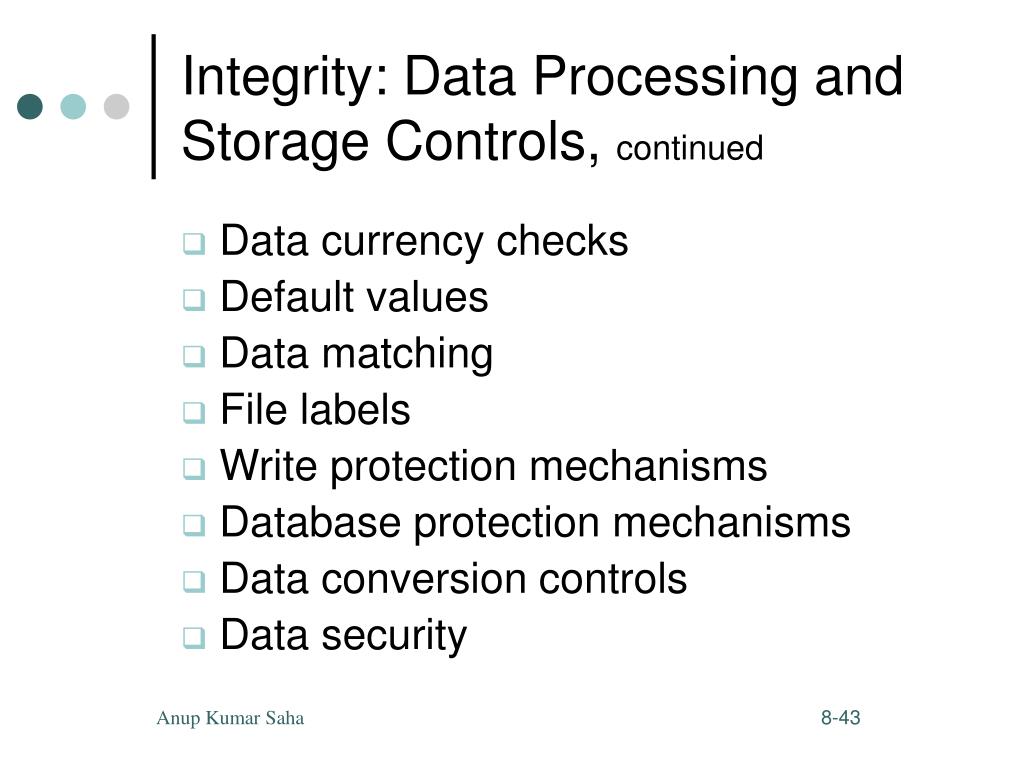 Integrity: Data Processing and Storage Controls, continued • Data currency checks • Default values • Data matching • File labels • Write protection mechanisms • Database protection mechanisms • Data conversion controls • Data security Anup Kumar Saha