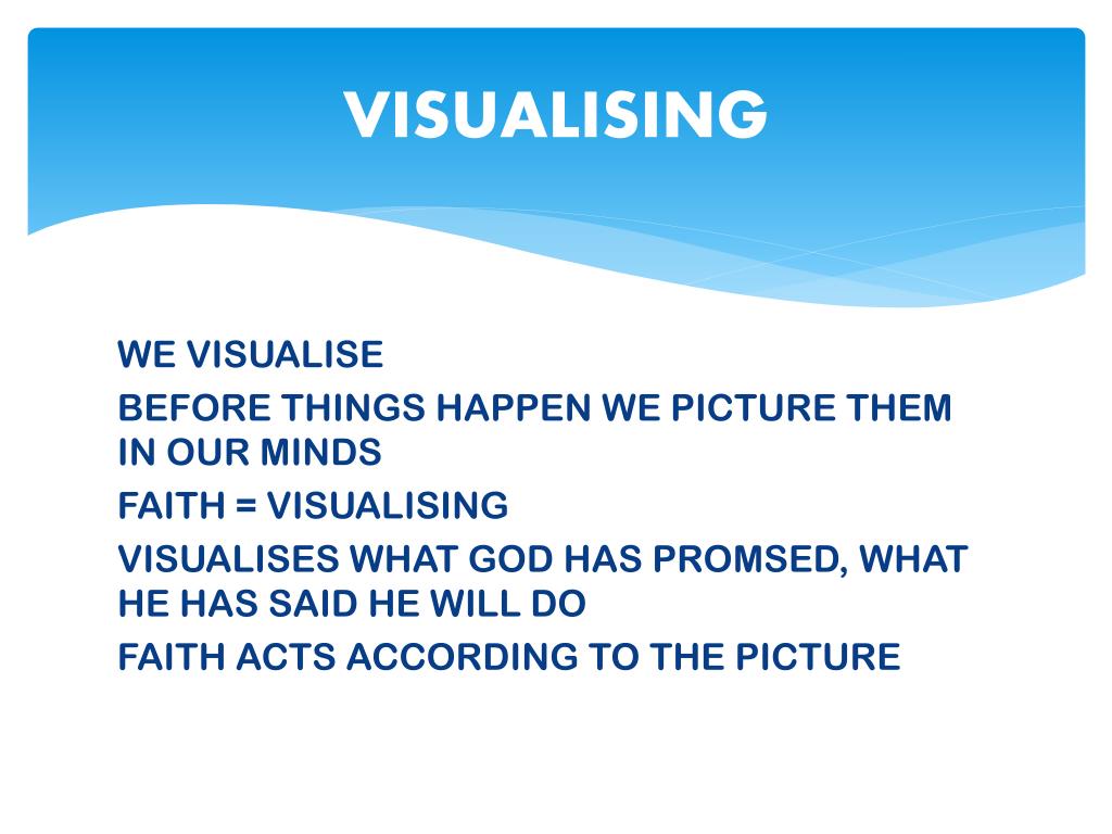 VISUALISING WE VISUALISE BEFORE THINGS HAPPEN WE PICTURE THEM IN OUR MINDS FAITH = VISUALISING VISUALISES WHAT GOD HAS PROMSED, WHAT HE HAS SAID HE WILL DO FAITH ACTS ACCORDING TO THE PICTURE