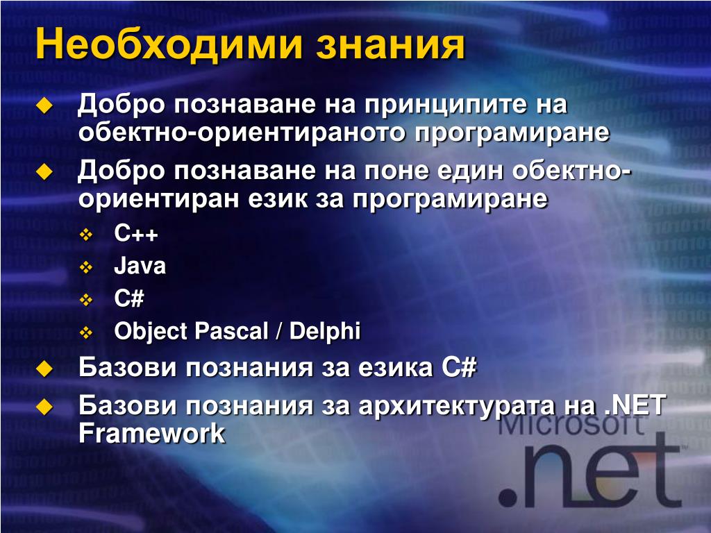 Необходими знания • Добро познаване на принципите на обектно-ориентираното програмиране • Добро познаване на поне единобектно-ориентиран език за програмиране • C++ • Java • C# • Object Pascal / Delphi • Базови познания за езика C# • Базови познания за архитектурата на .NET Framework