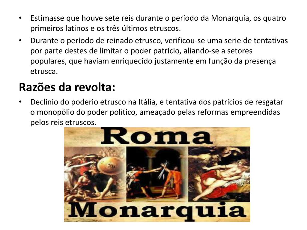 Estimasse que houve sete reis durante o período da Monarquia, os quatro primeiros latinos e os três últimos etruscos. • Durante o período de reinado etrusco, verificou-se uma serie de tentativas por parte destes de limitar o poder patrício, aliando-se a setores populares, que haviam enriquecido justamente em função da presença etrusca. Razões da revolta: • Declínio do poderio etrusco na Itália, e tentativa dos patrícios de resgatar o monopólio do poder político, ameaçado pelas reformas empreendidas pelos reis etruscos.