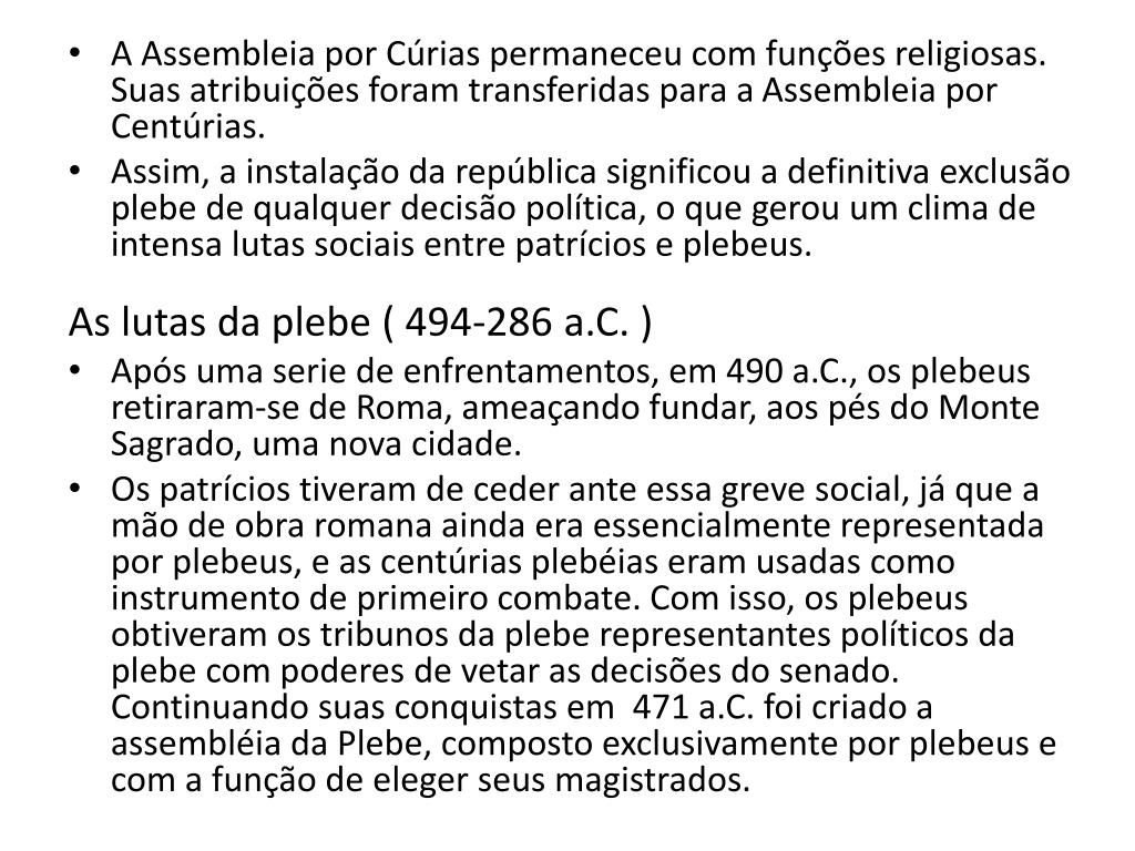 A Assembleia por Cúrias permaneceu com funções religiosas. Suas atribuições foram transferidas para a Assembleia por Centúrias. • Assim, a instalação da república significou a definitiva exclusão plebe de qualquer decisão política, o que gerou um clima de intensa lutas sociais entre patrícios e plebeus. As lutas da plebe ( 494-286 a.C. ) • Após uma serie de enfrentamentos, em 490 a.C., os plebeus retiraram-se de Roma, ameaçando fundar, aos pés do Monte Sagrado, uma nova cidade. • Os patrícios tiveram de ceder ante essa greve social, já que a mão de obra romana ainda era essencialmente representada por plebeus, e as centúrias plebéias eram usadas como instrumento de primeiro combate. Com isso, os plebeus obtiveram os tribunos da plebe representantes políticos da plebe com poderes de vetar as decisões do senado. Continuando suas conquistas em 471 a.C. foi criado a assembléia da Plebe, composto exclusivamente por plebeus e com a função de eleger seus magistrados.
